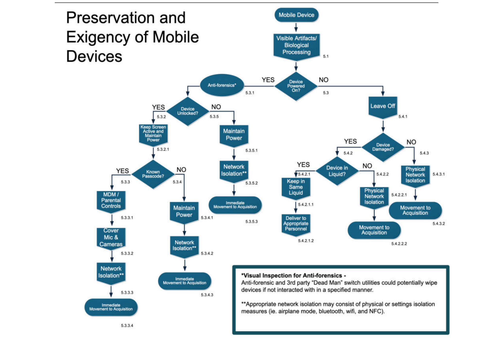 Just as Ricky couldn’t quite figure out what to do with his hands, the question I want to address and discuss is. Upon seizure (Meaning the moment when we get our grabbers on it), what do we do, and more importantly why does it matter. A quick consult of SWGDE’s Best Practices for Mobile Devices Evidence Collection & Preservation Handling and Acquisition, gives us a handy dandy chart. The specific part to discuss today is the concept seen below known as “Network Isolation”. Which is defined in the aforementioned document as:“Network Isolation: To reduce the potential of remote wipes or receipt of additional data,